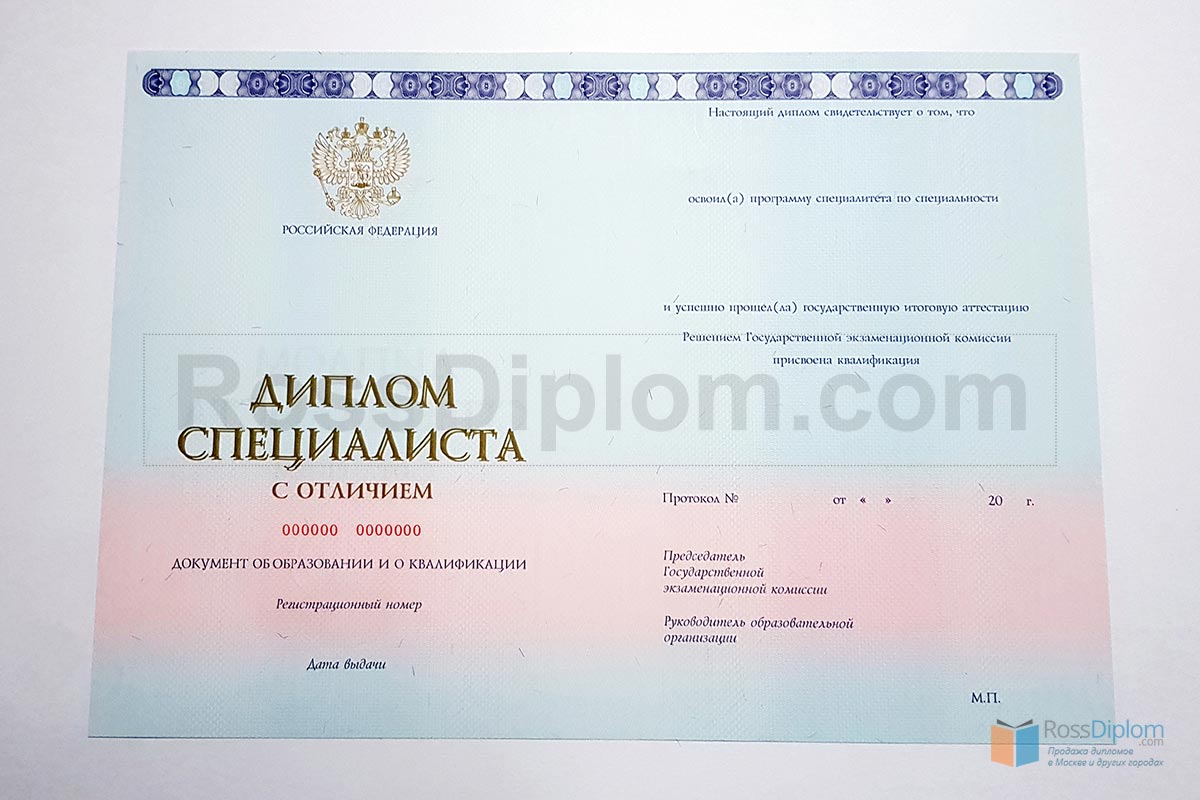 На нашем сайте Вы можете купить диплом специалиста, оформленный любым ВУЗом Москвы и других городов России. Данный диплом получают выпускники, прошедшие программу высшего образования в течение 5-6 лет и успешно защитивших выпускную квалификационную работу. Мы же предлагаем приобрести документ без обучения и всего за 1 день. Корочки, как в ВУЗе, изготавливаются на оригинальных бланках ГОЗНАКА, имеют необходимые степени защиты, печати, штампы, подписи. Гарантируем качество, безопасность и конфиденциальность!