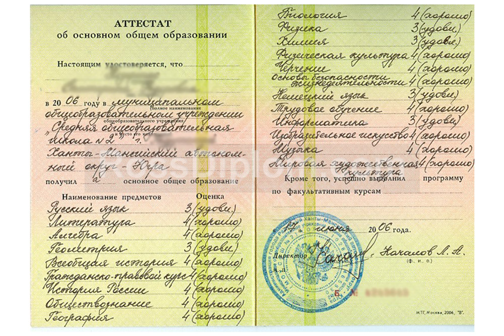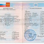 Покупая аттестат школы за 9 класс у нас, будьте уверены, что получите документ, который будет выглядеть так, как если бы Вы получили его в учебном заведении. Подпись директора и печать школы соответствуют оригиналам. При заказе у Вас есть возможность указать необходимые оценки по конкретным предметами, средний балл аттестата или отметки в процентном соотношении (30% — пятёрок, 40% — четвёрок, остальное — тройки).