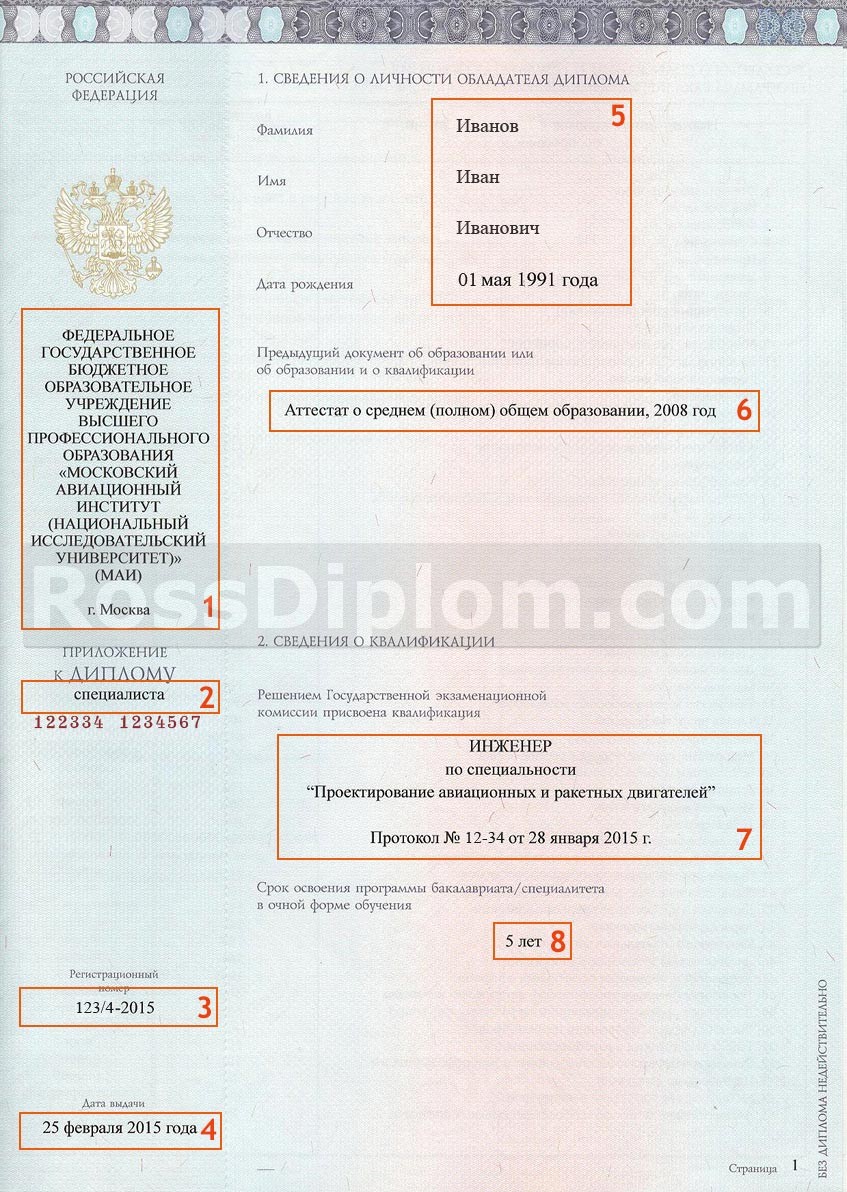 - №1. В приложении к диплому в строках под изображением герба РФ указывается полное официальное наименование организации, наименование населенного пункта, в котором находится организация (Здесь: Федеральное государственное бюджетное образовательное учреждение высшего профессионального образования «Московский авиационный институт (национальный исследовательский университет)» «МАИ» г. Москва).