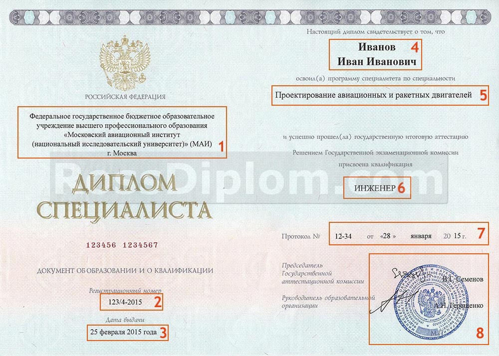 - №1. После строки, содержащей надпись «РОССИЙСКАЯ ФЕДЕРАЦИЯ» на отдельной строке (при необходимости — в несколько строк) — полное официальное название ВУЗа (согласно уставу), выдавшей диплом (Здесь: Федеральное государственное бюджетное образовательное учреждение высшего профессионального образования «Московский авиационный институт (национальный исследовательский университет)» «МАИ»); на отдельной строке (при необходимости — в несколько строк) — наименование населенного пункта, в котором находится организация (Здесь: г. Москва).